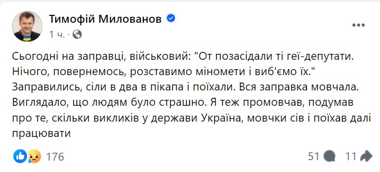 "Сегодня на заправке, военный: "Вот засели те геи-депутаты. Ничего, вернемся, расставим минометы и выбьем их". Заправились, сели в два пикапа и поехали. Вся заправка молчала. Выглядело, что людям было страшно. Я тоже промолчал. Подумал о том, сколько вызовов у государства Украина, молча сел и поехал дальше", – написал он.