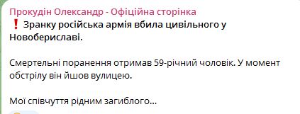 10.50 Утром от обстрел рф в Херсонской области погиб гражданский 59-летний мужчина в Новобериславе.