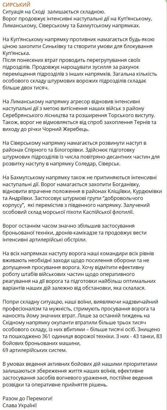 Армия РФ продолжает интенсивные наступательные действия на Купянском, Лиманском, Северском и Бахмутском направлениях.