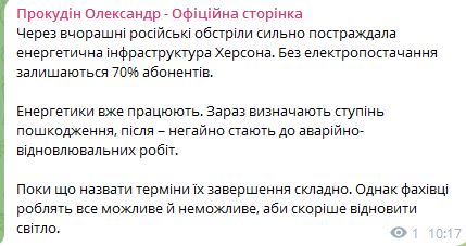 Из-за вчерашних российских обстрелов в Херсоне сильно пострадала энергетическая инфраструктура. Без электроснабжения остаются 70% абонентов.