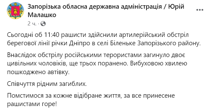 18:20 В результате обстрела села Беленькое Запорожской области погибли два человека, еще трое ранены.