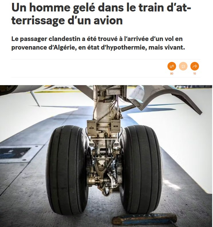 Безбилетный 20-летний пассажир был обнаружен в состоянии сильного переохлаждения в аэропорту Париж-Орли в шасси рейса, прибывшего из Алжирского города Оран.