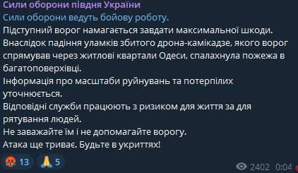 "В результате падения обломков сбитого дрона-камикадзе, которого враг направил через жилые кварталы Одессы, вспыхнул пожар в многоэтажке. Информация о масштабах разрушений и пострадавших уточняется. Соответствующие службы работают с риском для жизни для спасения людей", - отмечается в сообщении.
