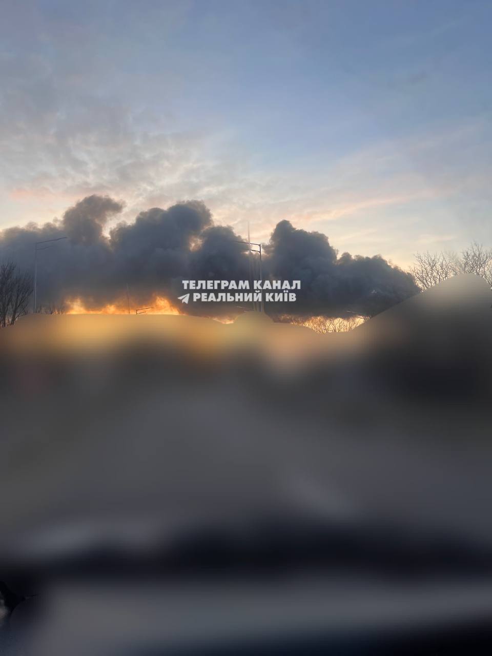 Киевские паблики публикуют фото пожара в Киеве после прилета. По их данным, может гореть парковка.
