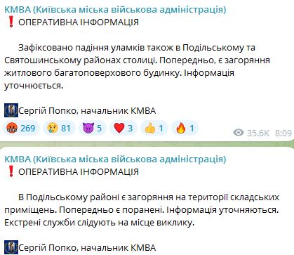 Киевская городская военная администрация сообщает о падении обломков в нескольких районах Киева.