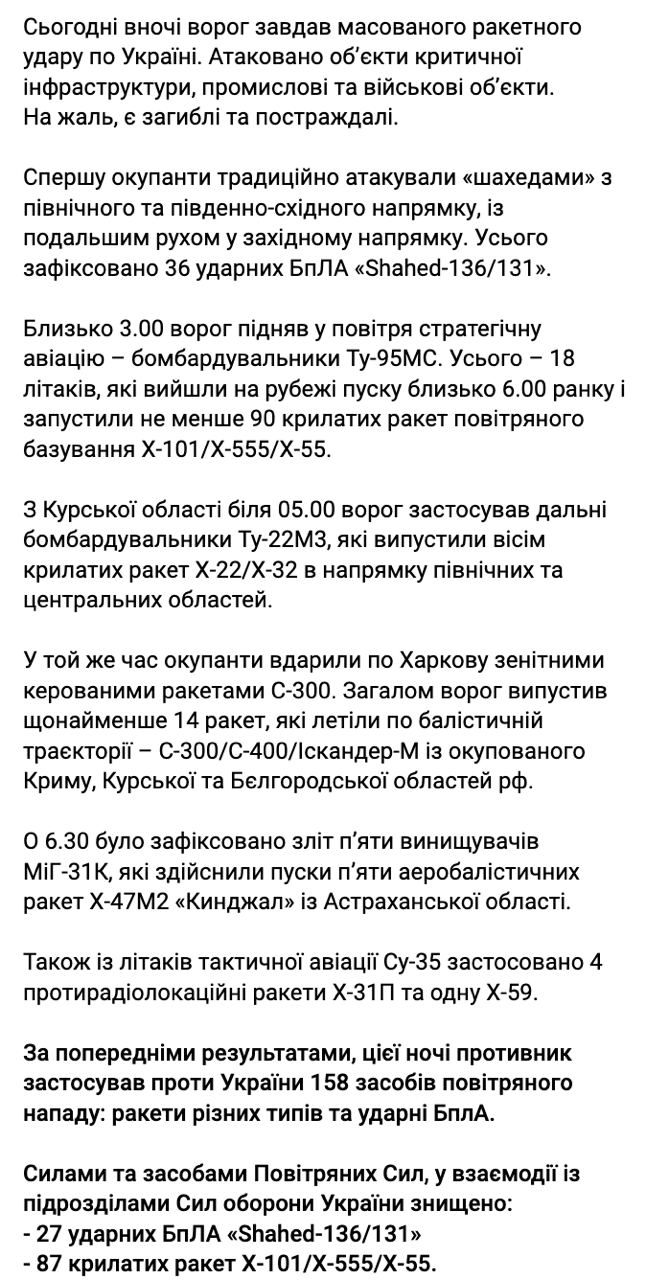 В пятницу, 29 декабря, силы рф выпустили по Украине 122 ракеты и 36 "Шахедов".
