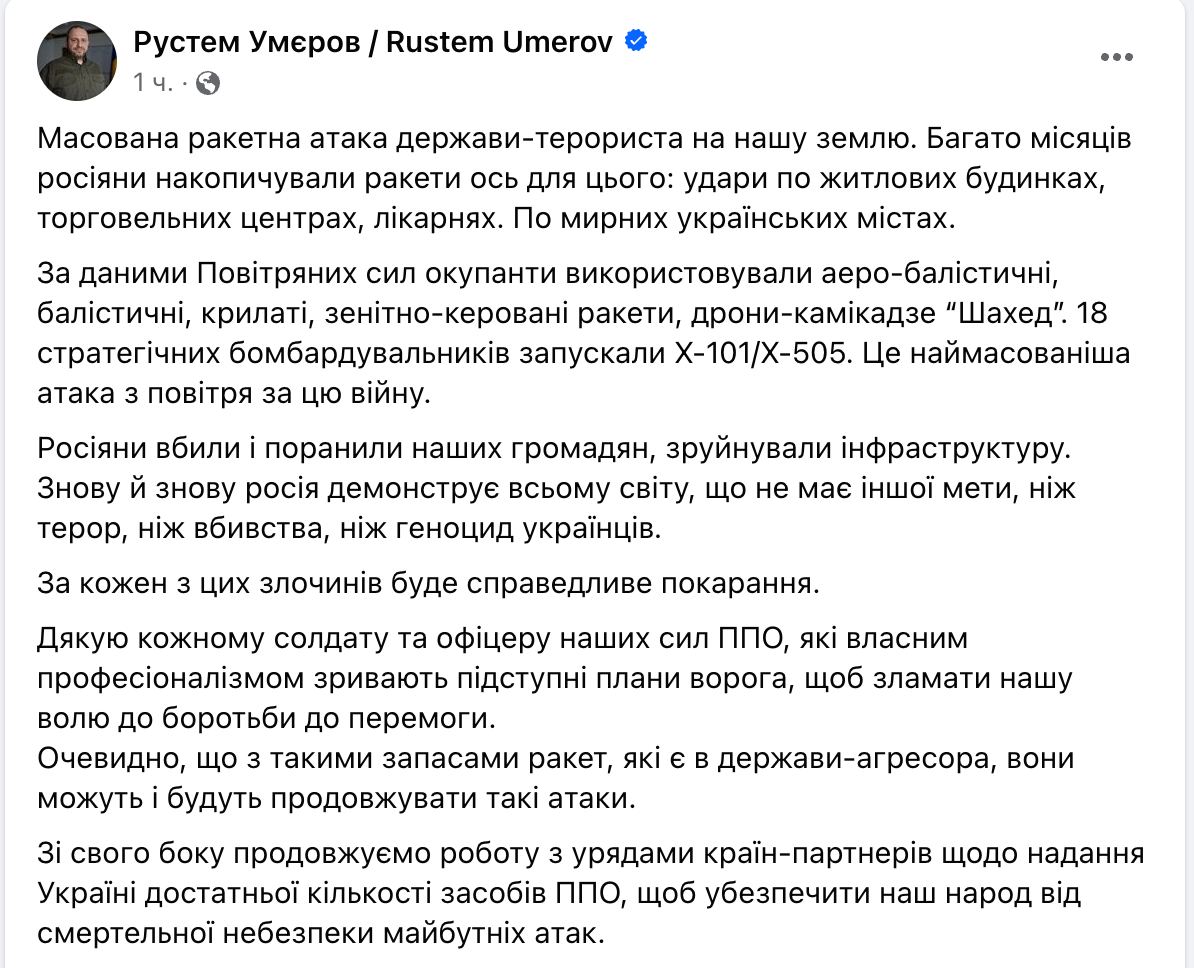 У РФ хватит запаса ракет, чтобы повторять такие же атаки, как сегодня утром - Умеров