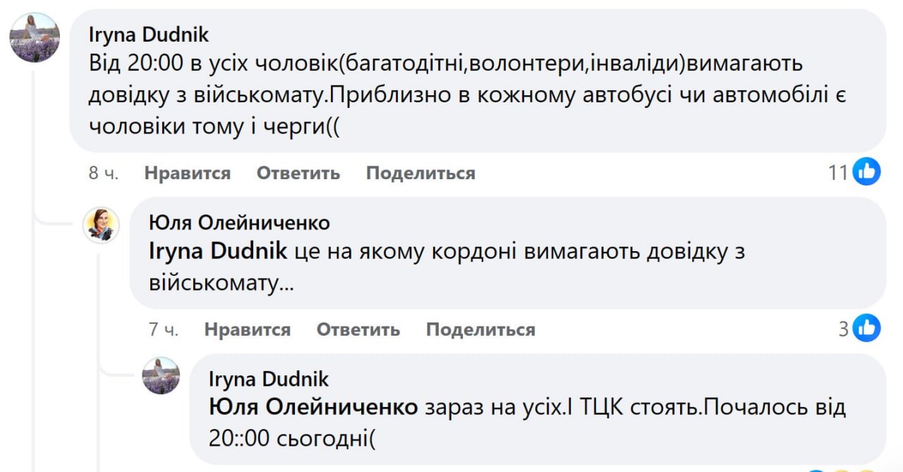 "С 20:00 у всех мужчин (многодетные, волонтеры, инвалиды) требуют справку из военкомата. Приблизительно в каждом автобусе или автомобиле есть мужчины, поэтому и очереди", - написала одна из пользовательниц.