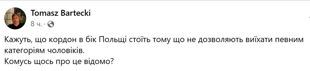 "Говорят, что граница в сторону Польши стоит, потому что не позволяют уехать определенным категориям мужчин", - пишет другой пользователь.