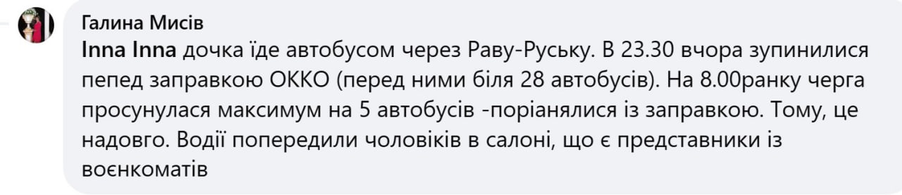 "Дочь едет автобусом через Раву-Русскую. В 23.30 вчера остановились перед заправкой ОККО (перед ними около 28 автобусов). На 8.00 утра очередь продвинулась максимум на 5 автобусов. Это надолго. Водители предупредили мужчин в салоне, что есть представители военкоматов (на границе)", - пишет женщина.