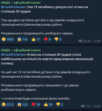 "Вчерашняя ракетная атака уже стала самой массовой по количеству жертв среди гражданских, хотя разбор завалов еще продолжается", - написал мэр Кличко.
