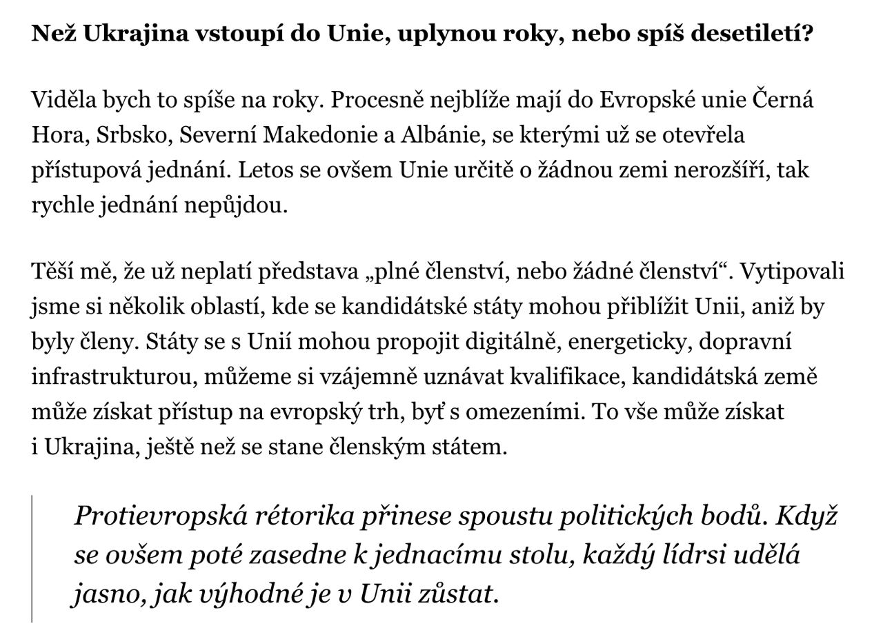 На вопрос журналиста Novinky, пройдут ли годы или десятилетия, прежде чем Украина присоединится к Союзу, она ответила: "Я бы сказала, что это скорее годы".