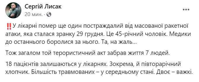 "В больнице скончался еще один пострадавший от массированной ракетной атаки, которая произошла утром 29 декабря. Это 45-летний мужчина. Медики до последнего сражались за него", - написал он.