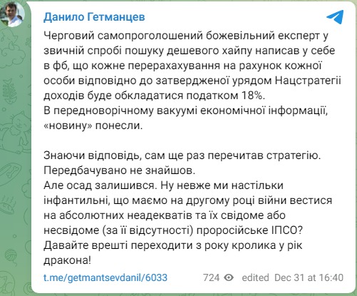 "Очередной самопровозглашенный безумный эксперт в привычной попытке поиска дешевого хайпа написал у себя в Фейсбуке, что каждое перечисление на счет каждого лица в соответствии с утвержденной правительством Нацстратегией доходов будет облагаться налогом в 18%. В предновогоднем вакууме экономической информации "новость" понесли. Зная ответ, он еще раз перечитал стратегию. Предсказуемо не нашел", - сказано в посте депутата.