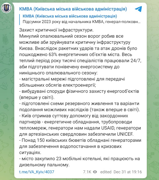 "В результате ракетных ударов и атак дронов было повреждено 63% энергетических объектов города", - сказано в посте.