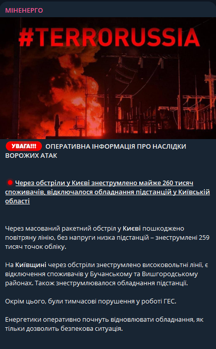 Энергетики начнут восстанавливать оборудование, как только позволит ситуация безопасности. Укрэнерго заявляет, что применение графиков отключений не планируется.