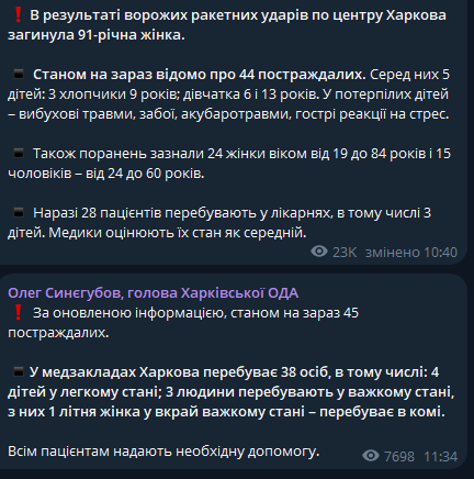 "В медучреждениях Харькова находятся 38 человек, в том числе: 4 детей в легком состоянии; 3 человека находятся в тяжелом состоянии, из них 1 пожилая женщина в крайне тяжелом состоянии – находится в коме", - написал глава Харьковской ОВА.