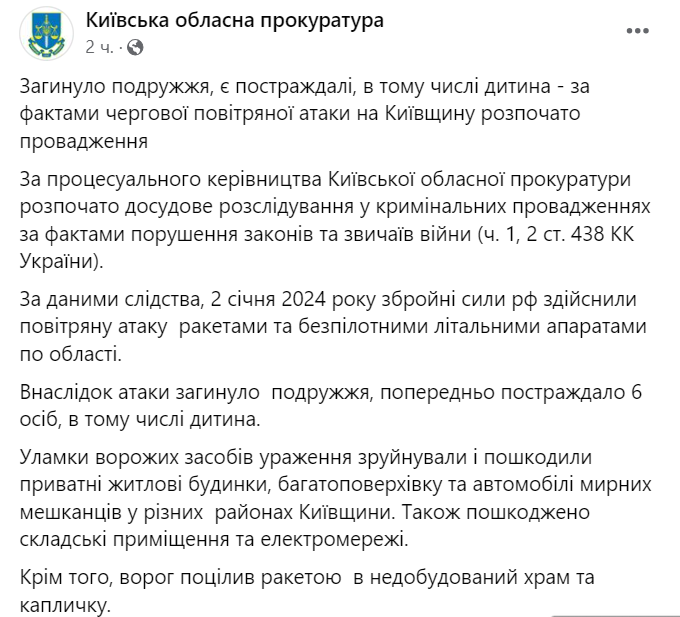 "По данным следствия, 2 января 2024 года вооруженные силы России совершили воздушную атаку ракетами и беспилотными летательными аппаратами по области", - говорится в сообщении.