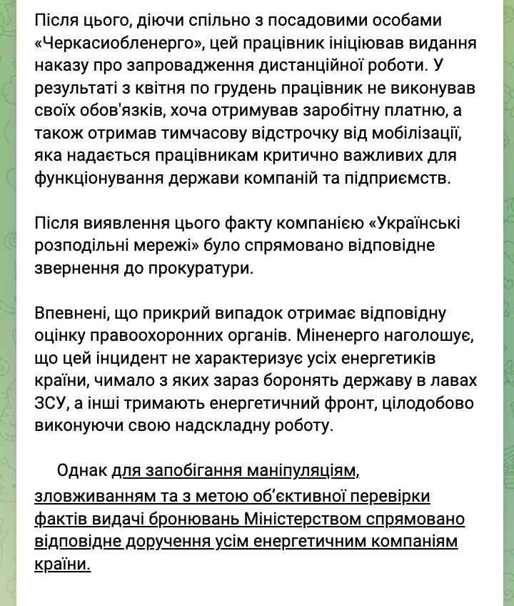 Был выявлен факт злоупотребления бывшим советником министра энергетики, которого для уклонения от службы зачислили на работу в "Черкассыоблэнерго", которую он игнорировал, получая зарплату.