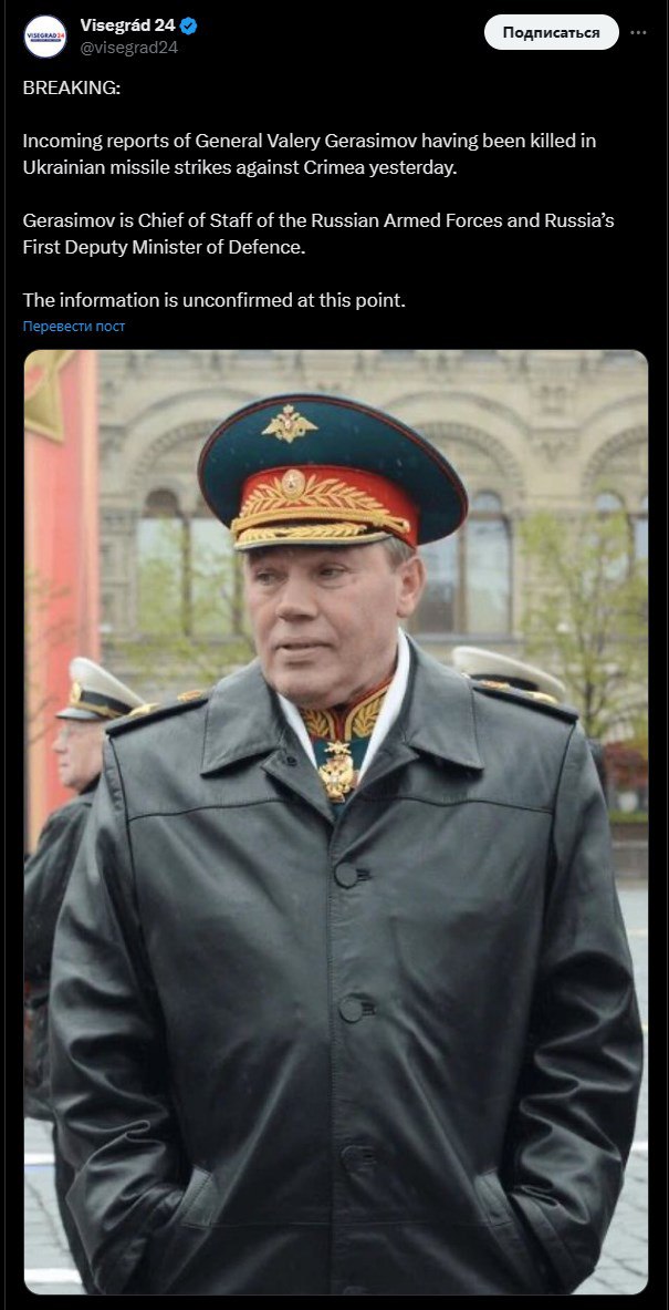 14.15 Паблик Visegrád 24 пишет о гибели начальника Генштаба РФ Валерия Герасимова. Якобы он погиб вчера в результате ракетного удара Украины по Крыму.