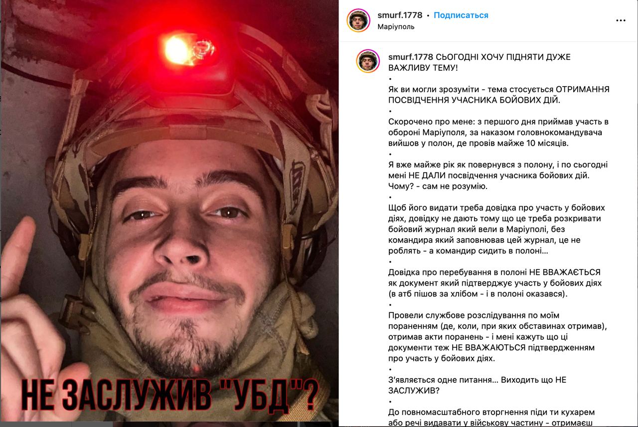 "Почему? Сам не понимаю. Чтобы его выдать, нужна справка об участии в боевых действиях. Справку не дают, потому что это надо вскрывать боевой журнал, который вели в Мариуполе. Без командира, который заполнял этот журнал, это не делают. А командир сидит в плену", - описывает проблему Смурф.