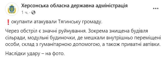 Утром, 6 января, российские военные атаковали Тягинскую общину Херсонской области. В результате уничтожены сельсовет и модульные домики переселенцев.