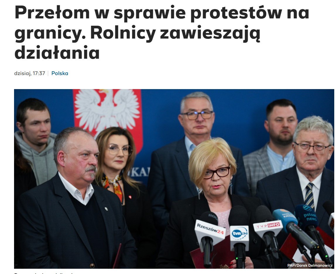 О том, что правительство Польши подпишет соглашение с фермерами для прекращения блокады украинской границы в Медыке, сообщалось сегодня днем. Министр сельского хозяйства и развития села Польши Чеслав Секерский пообещал дать письменные гарантии выполнения требований протестующих.