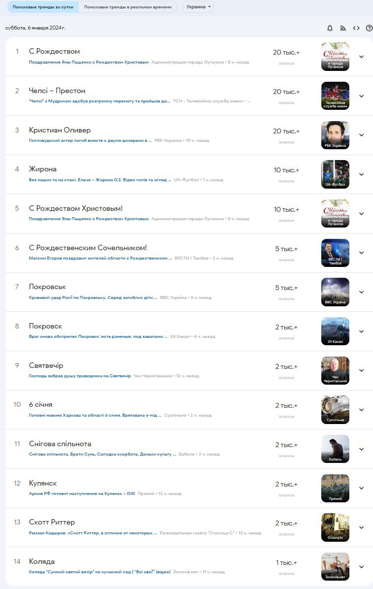 Также в список самых популярных запросов из Украины 6 января вошли "С Рождеством Христовым!", "С Рождественским Сочельником!", "Святвечір" и "Коляда".