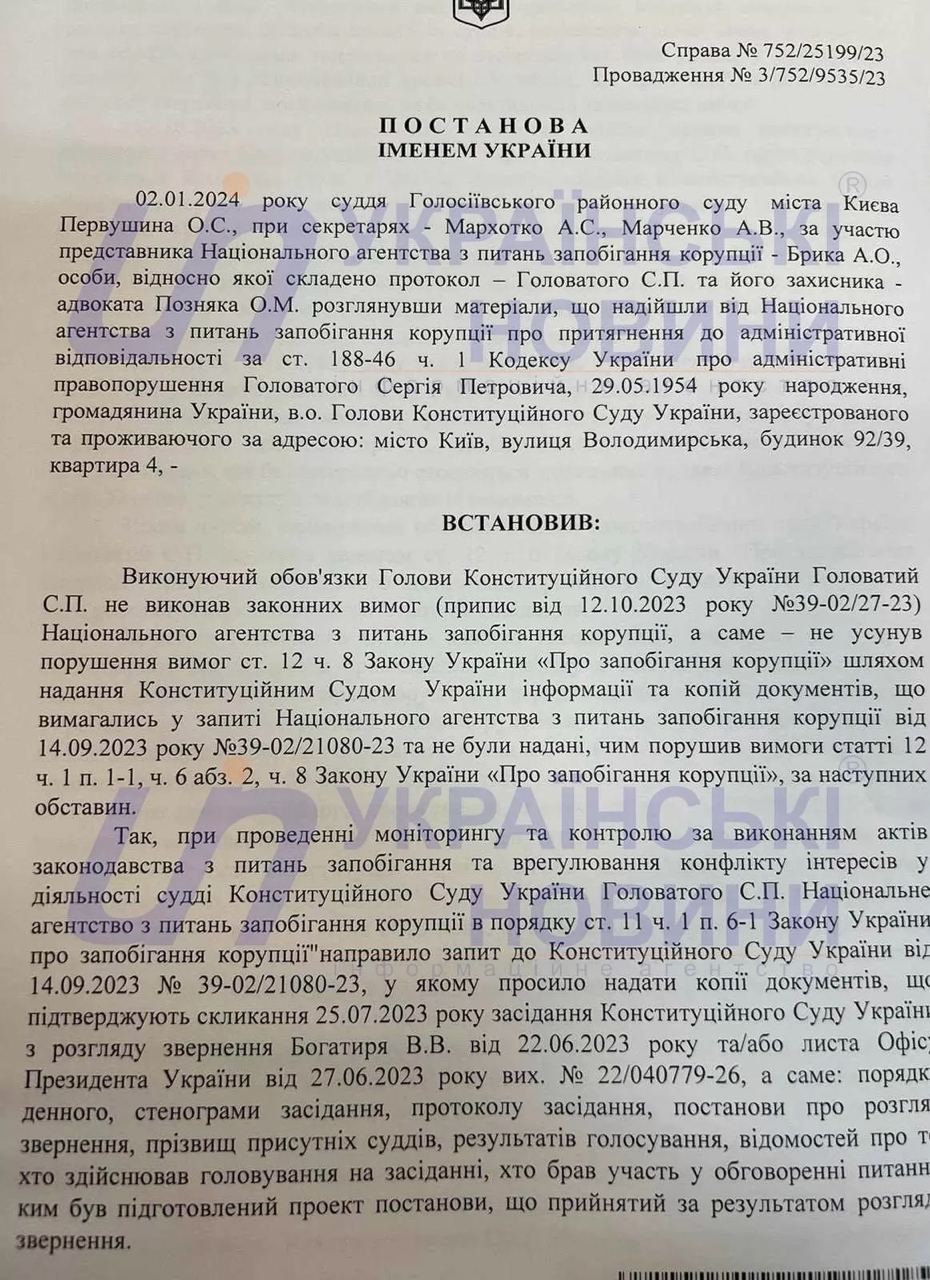 Голосеевский суд Киева признал виновным и.о. главы Конституционного суда Сергея Головатого за отказ предоставить НАПК (Национальное агентство предотвращения коррупции) запрашиваемые документы.