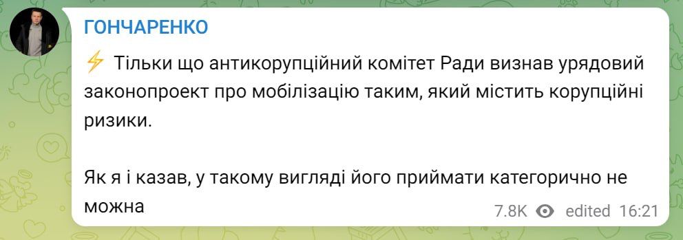 Об этом сообщил народный депутат Алексей Гончаренко в своем телеграм-канале.