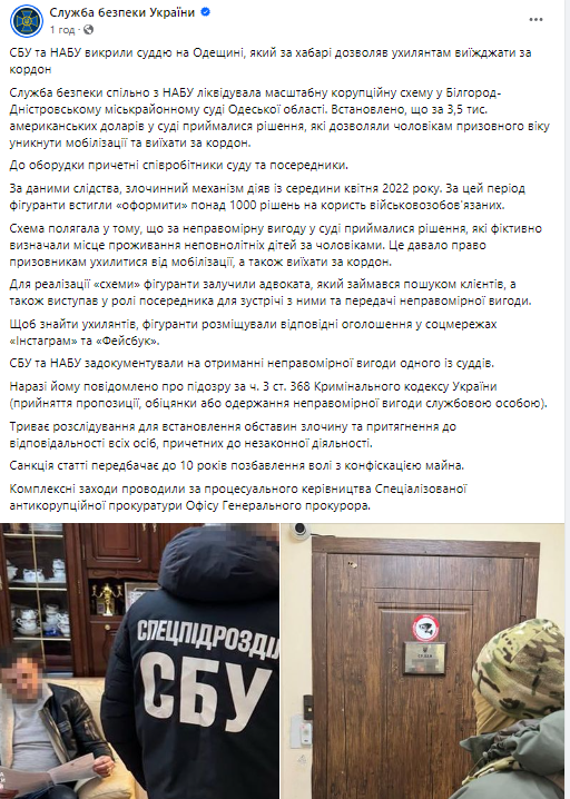 В Одесской области СБУ задержала судью, который, по версии следствия, за довольно скромные по нынешним меркам суммы помогал военнообязанным мужчинам уехать за границу.
