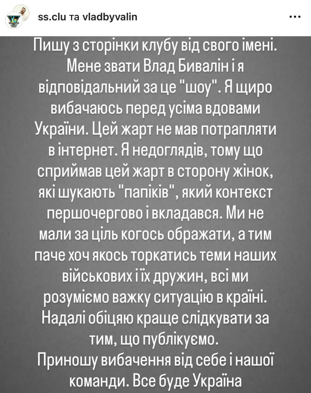 "Мы не ставили целью кого-то обижать, а тем более касаться темы наших военных и их жен, все мы понимаем тяжелую ситуацию в стране", - написал от имени команды шоу Влад Бывалин.