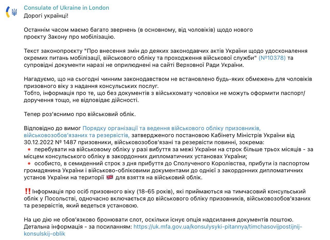 13.15 Консульство Украины в Лондоне призвало украинцев за границей встать на военный учет.