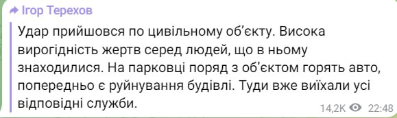 22:54 В Харькове ракетный удар пришелся по гражданскому объекту, сообщил мэр города Терехов.