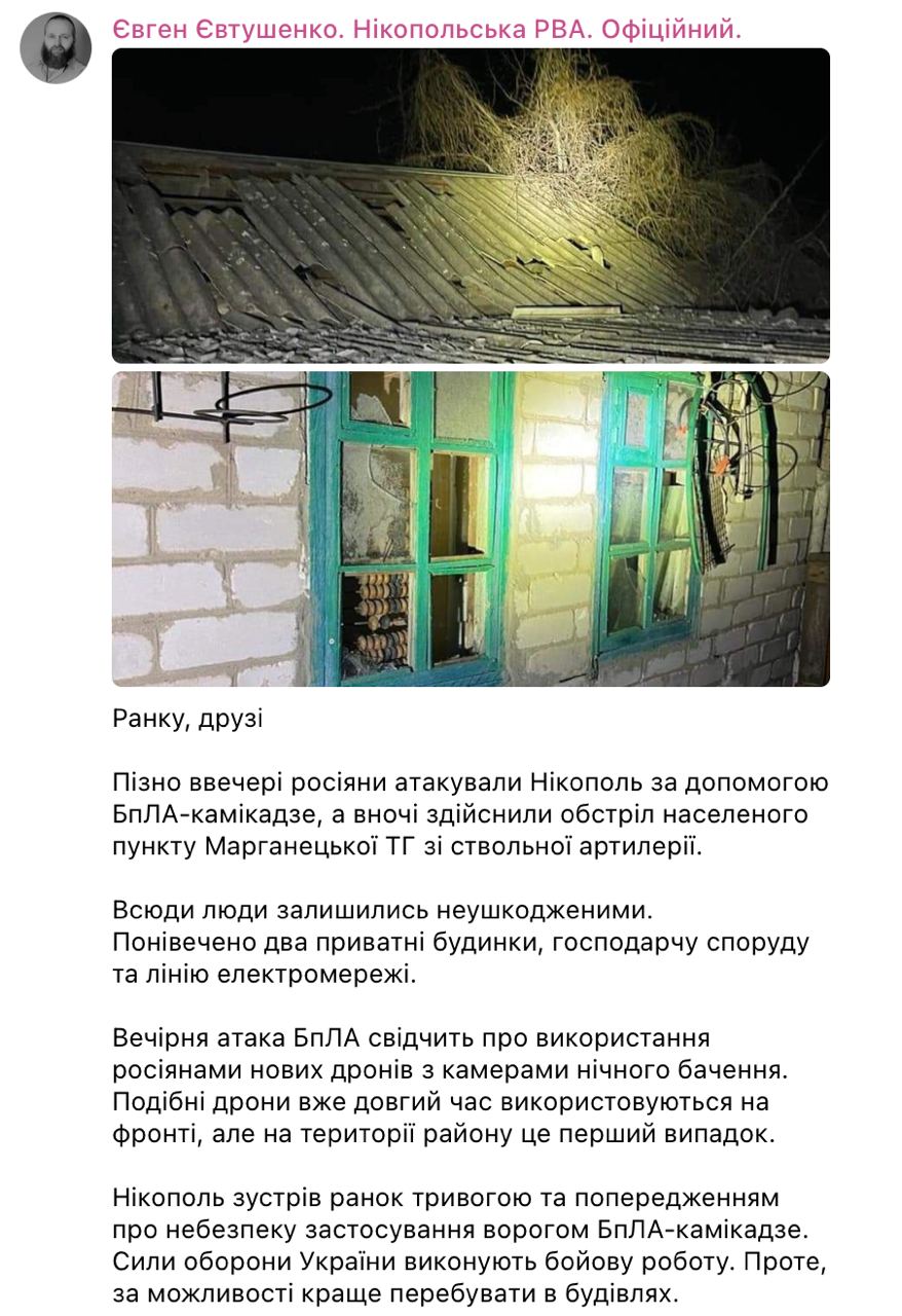 "Вечерняя атака БпЛА свидетельствует об использовании россиянами новых дронов с камерами ночного видения. Подобные дроны уже долгое время используются на фронте, но на территории района это первый случай", - сообщил Евгений Евтушенко.