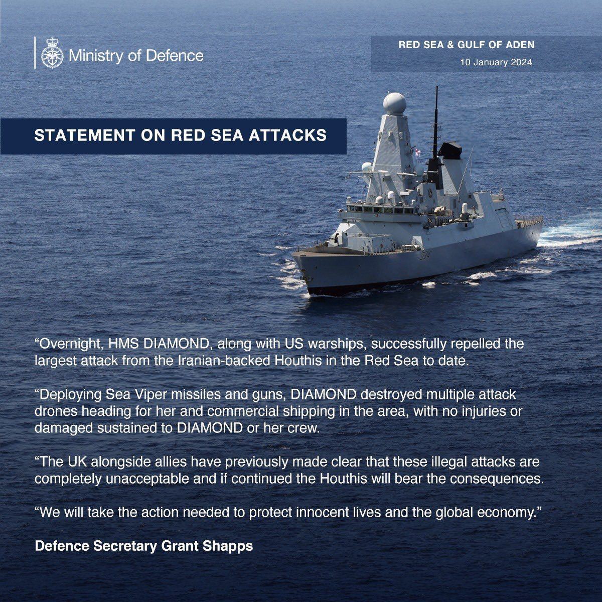 "Ночью HMS DIAMOND вместе с военными кораблями США успешно отразил крупнейшую на настоящий момент атаку в Красном море со стороны поддерживаемых Ираном хуситов. Задействовав ракеты Sea Viper и свои орудия, DIAMOND уничтожил множество ударных беспилотников, направлявшихся к нему и торговым судам в регионе", - говорится в сообщении.