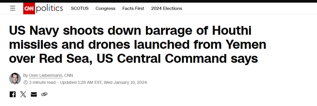 По информации CNN, военные корабли США сбили над Красным морем 24 ракеты и беспилотника.