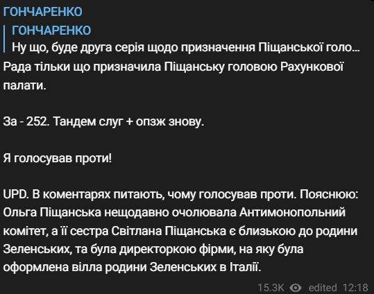 "Ольга Пищанская недавно возглавляла Антимонопольный комитет, а ее сестра Светлана Пищанская является близкой к семье Зеленских, и была директором фирмы, на которую была оформлена вилла семьи Зеленских в Италии", - написал Гончаренко.