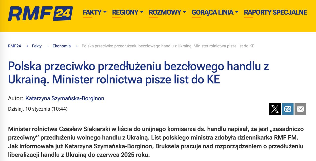 Секерский заявляет, что полная либерализация торговли с Украиной, введенная ЕС после вторжения РФ, имела "противоположный эффект", создав проблемы с чрезмерным импортом зерновых, сахара, мяса птицы, яиц, мягких фруктов (особенно замороженной малины), яблочного концентрата.