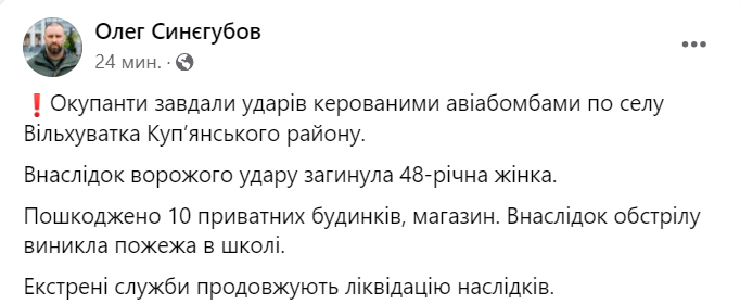 Сегодня российские войска ударили по селу Ольховатка Купянского района управляемыми авиабомбами. Погибла женщина.