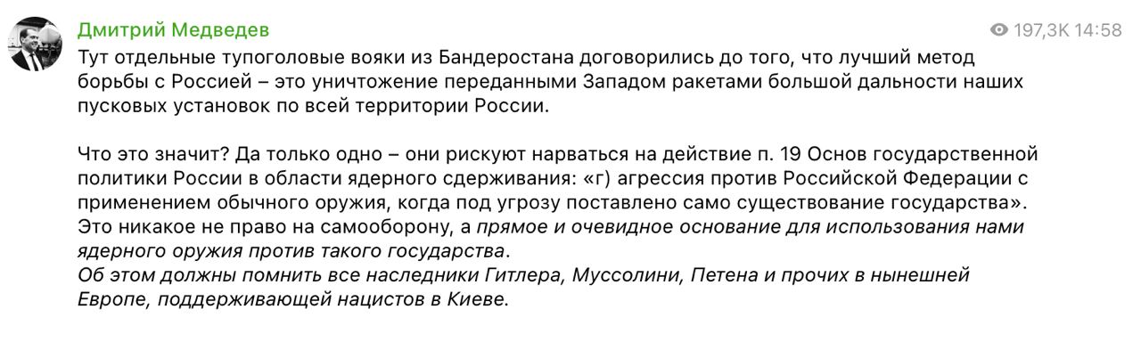 Немногим позже в своем телеграм-канале Медведев написал, что попытки Украины уничтожить западными ракетами пусковые установки на территории РФ будут для Москвы основанием для использования ядерного оружия согласно пункту "г" статьи 19 ядерной доктрины РФ. Этот пункт дает следующее основание для применения Россией ядерного оружия: "Агрессия против Российской Федерации с применением обычного оружия, когда под угрозу поставлено само существование государства".