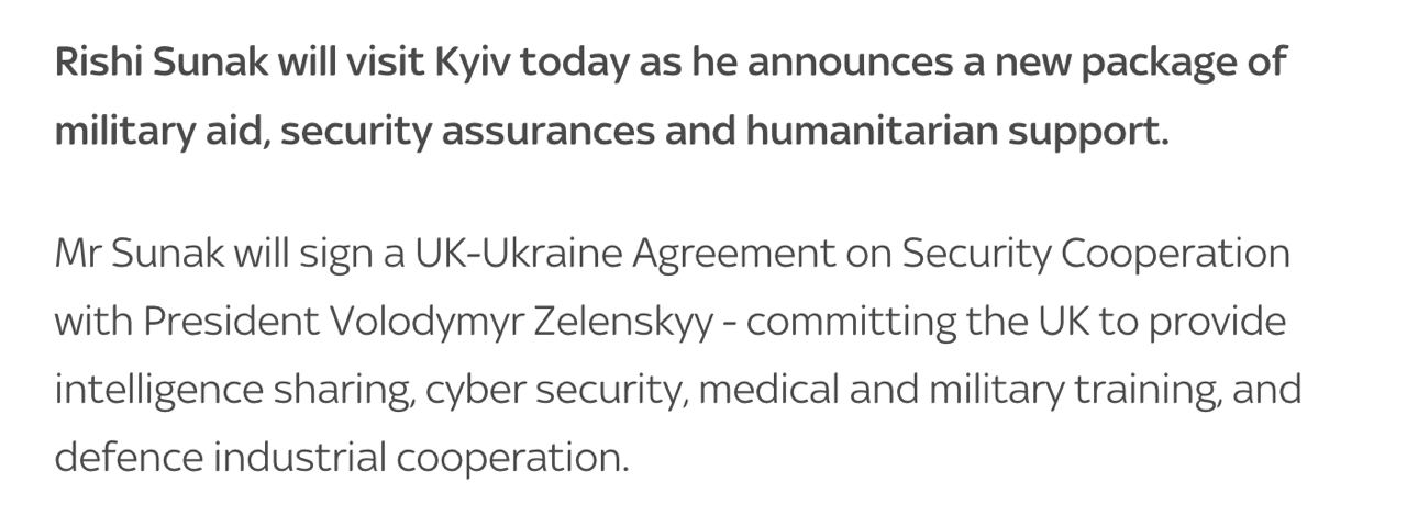 В пятницу, 12 января, премьер-министр Великобритании Риши Сунак посетит Киев и подпишет с президентом Украины Владимиром Зеленским соглашение о гарантиях безопасности.