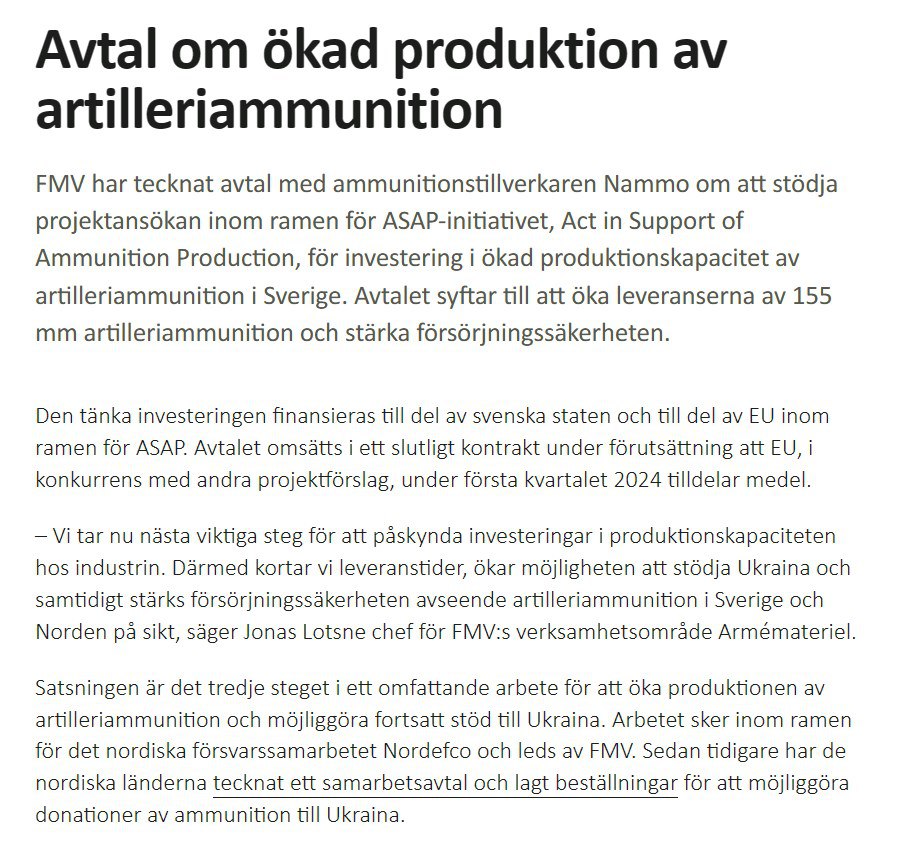 Заказ на 155-мм снаряды получит норвежско-финская компания Nammo. Он будет оплачен шведским государством и частично за счет Евросоюза.