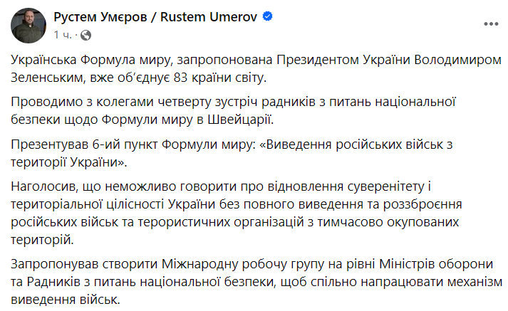 "Проводим с коллегами четвертую встречу советников по вопросам национальной безопасности по формуле мира в Швейцарии. Презентовал шестой пункт формулы мира: "Вывод российских войск с территории Украины". Невозможно говорить о восстановлении суверенитета и территориальной целостности Украины без полного разоружения и вывода армии РФ с временно оккупированных территорий.