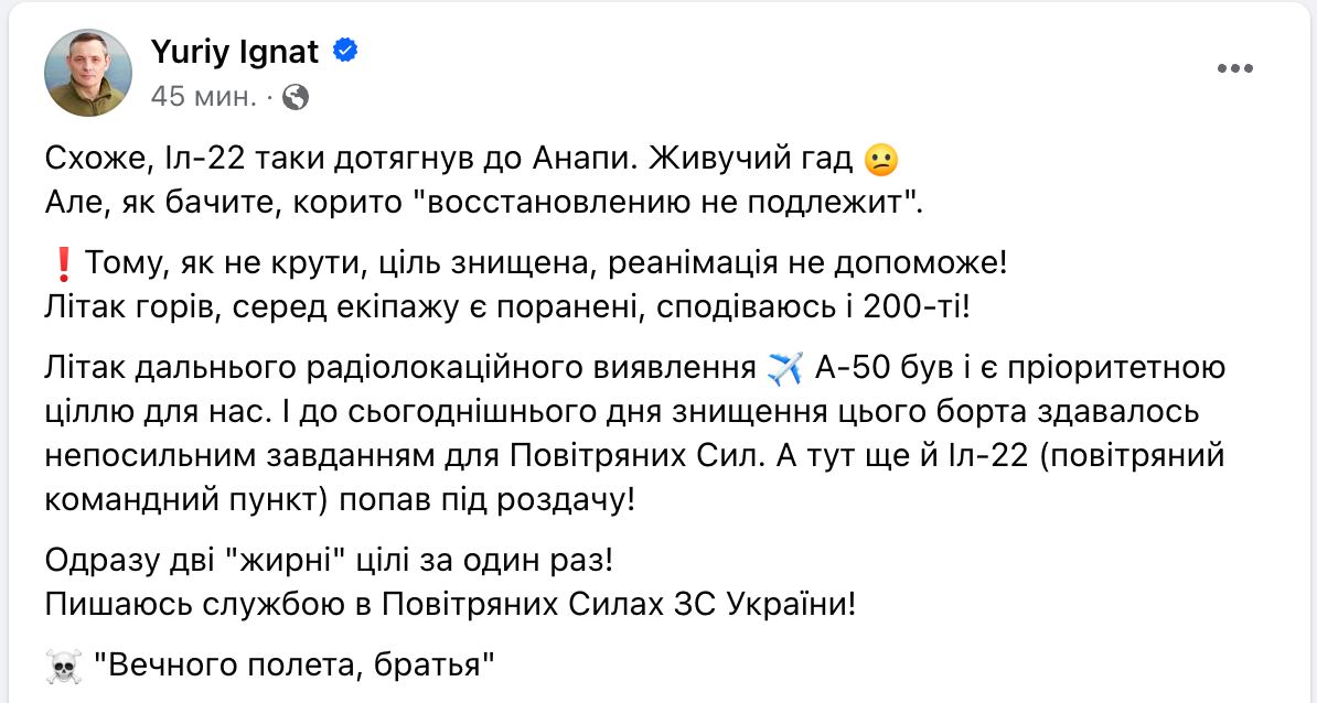 Игнат сказал, что до сегодняшнего дня уничтожение самолета дальнего радиолокационного обнаружения А-50 "казалось непосильной задачей" для ВСУ, но удалось сбить "сразу две "жирные" цели за один раз".