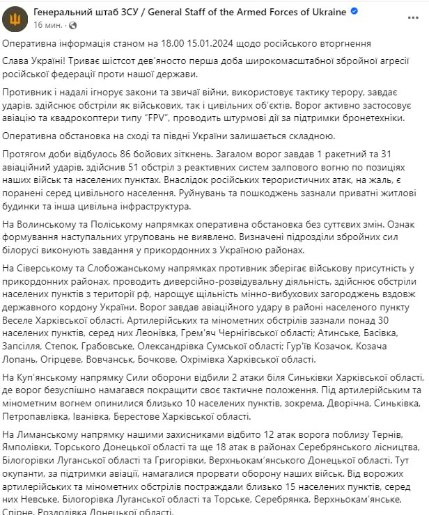 В понедельник, 15 января, в Украине идет 691-й день войны.