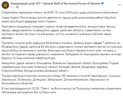 В понедельник, 15 января, Генштаб ВСУ обнародовал сводку о ситуации на фронте за минувшие сутки.