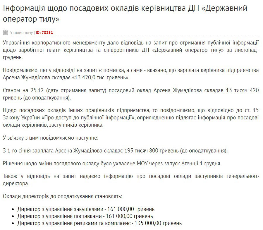 С 1 января зарплата главы Государственного оператора тыла Арсена Жумадилова составляет 193 тысяч 800 гривен.