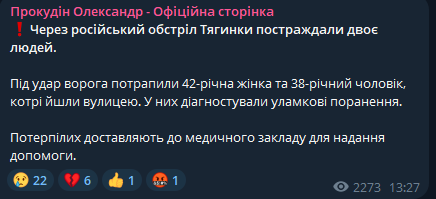 "Из-за российских обстрелов Тягинки пострадали два человека. Под удар врага попали 42-летняя женщина и 38-летний мужчина, которые шли по улице. У них диагностировали осколочные ранения. Пострадавших доставляют в медицинское учреждение для оказания помощи" - говорится в сообщении.