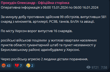 "За прошедшие дни противник совершил 99 обстрелов, выпустив 581 снаряд из минометов, артиллерии, РСЗО, танков, БпЛА и авиации. По городу Херсон враг выпустил 16 снарядов" - говорится в сообщении.